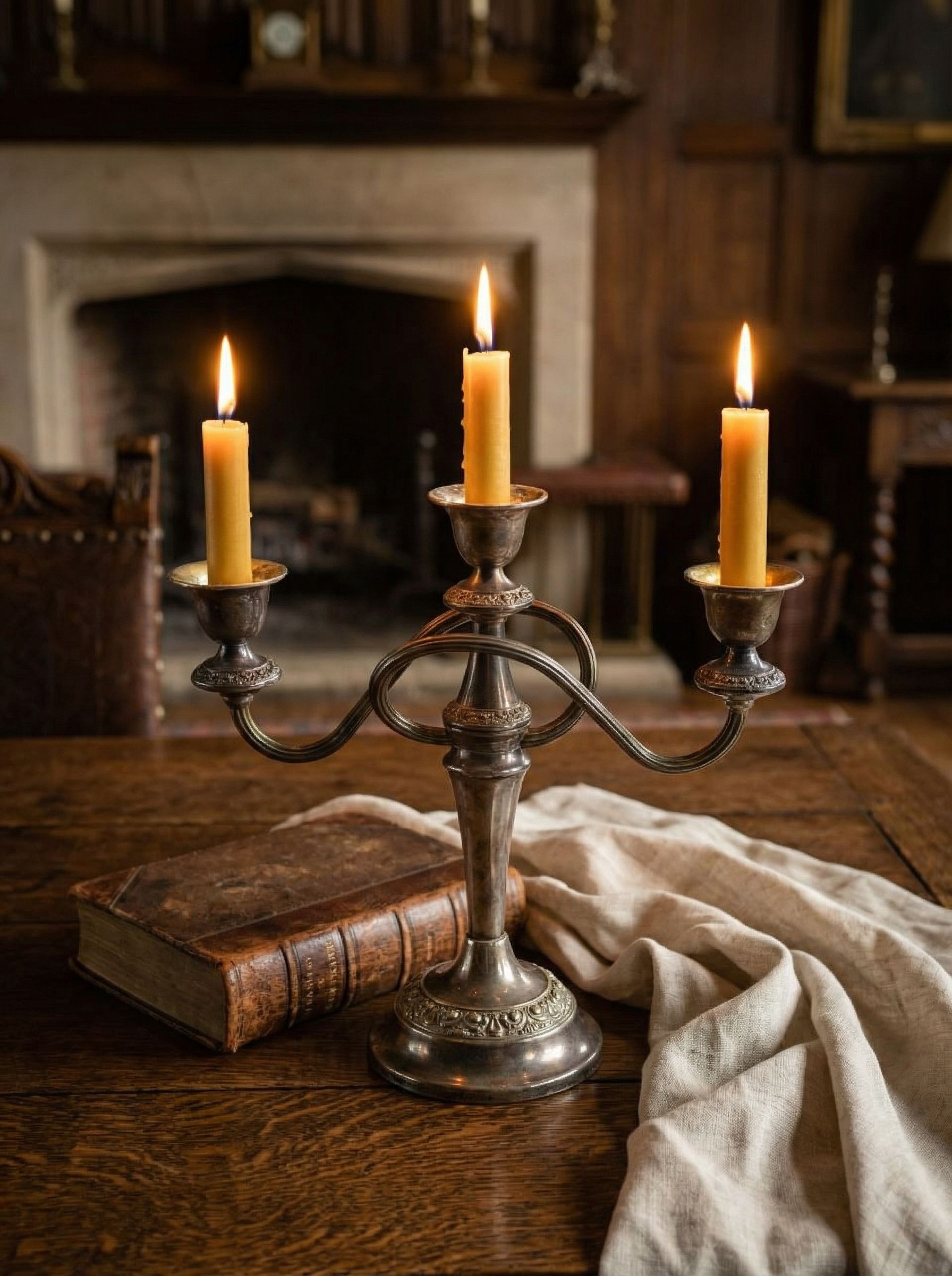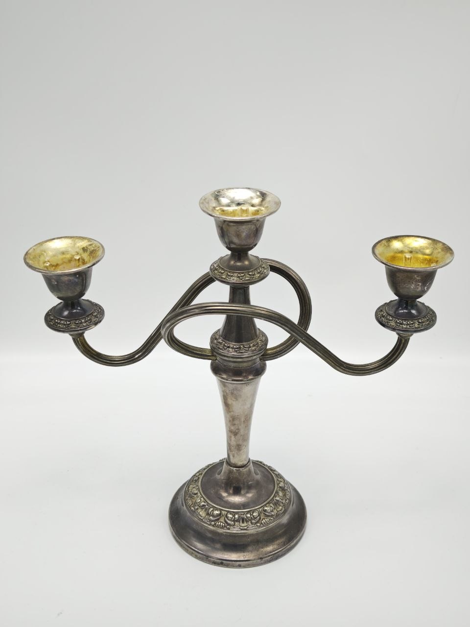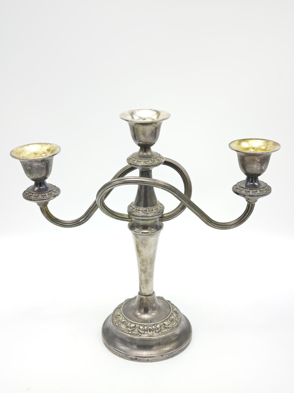 Канделябр Ianthe England выполнен в классическом английском стиле с изящными изогнутыми рожками и декоративным орнаментом по основанию. Изделие имеет серебряное покрытие и тёплый благородный блеск с естественной патиной времени. Размер 25×25 см, вес 800 г — гармоничный формат для сервировки или интерьерного акцента. Внутренняя часть подсвечников имеет характерный золотистый оттенок, подчёркивающий глубину изделия. Отлично впишется в классический интерьер, создавая атмосферу уюта и мягкого света.