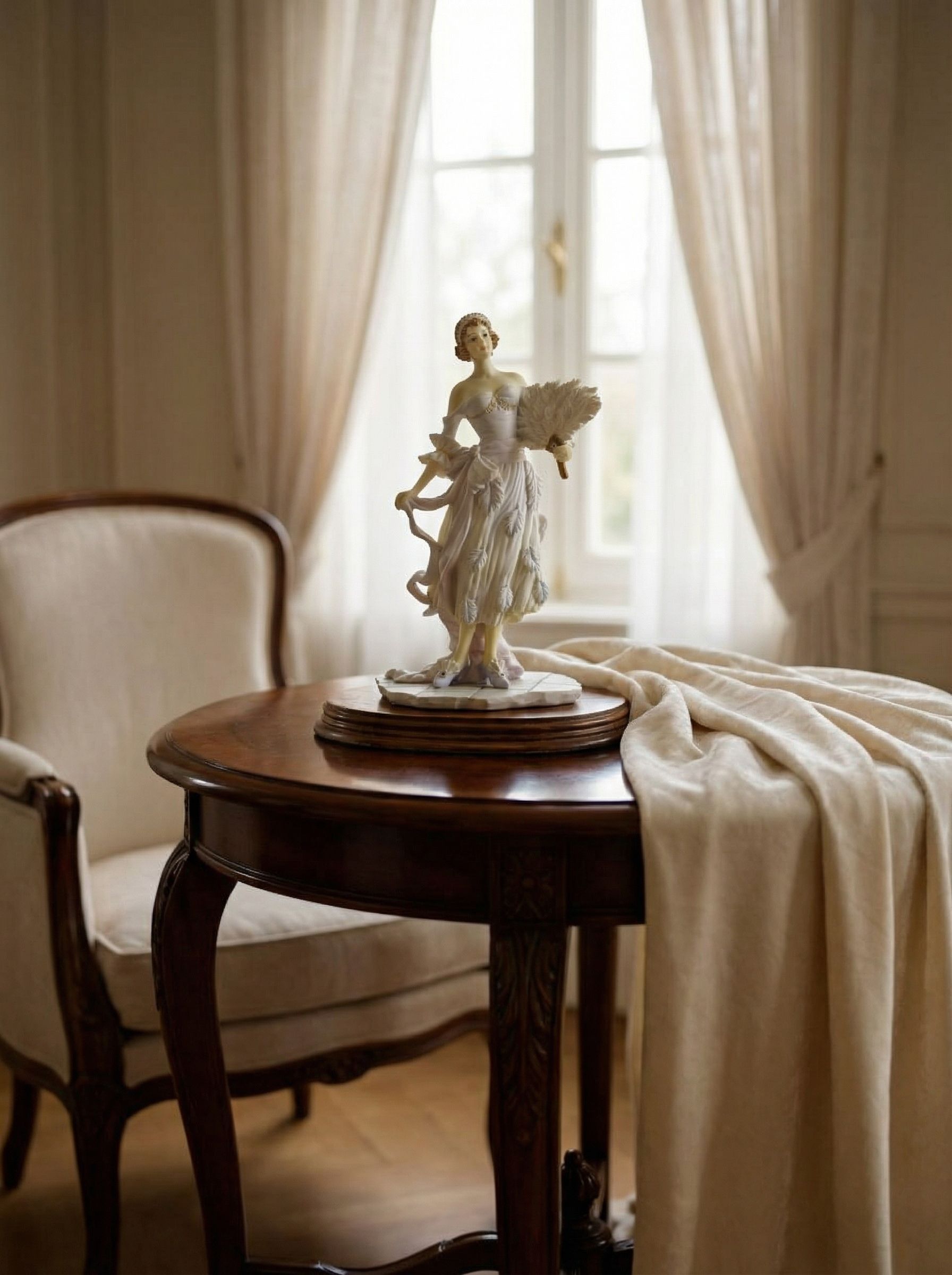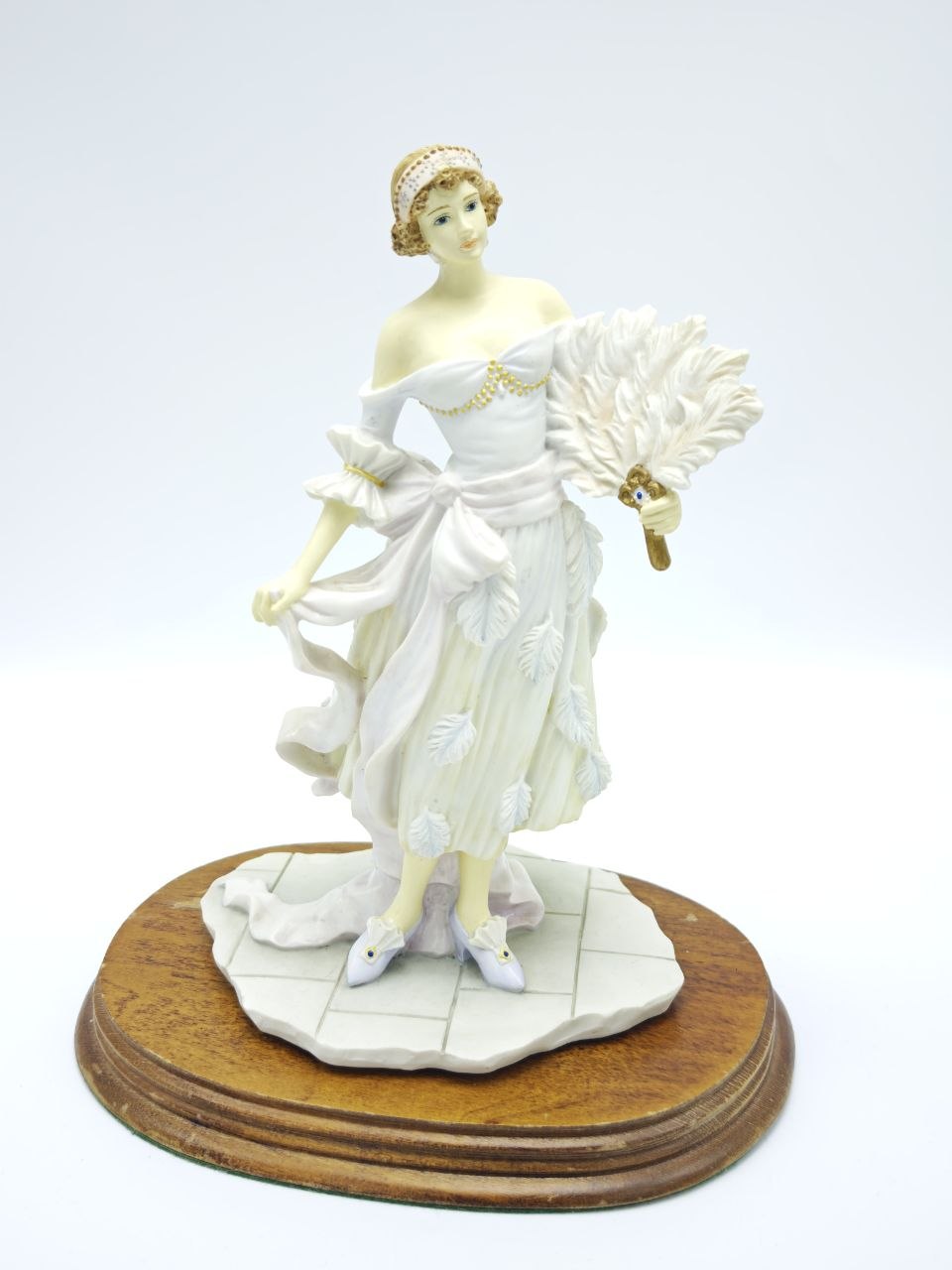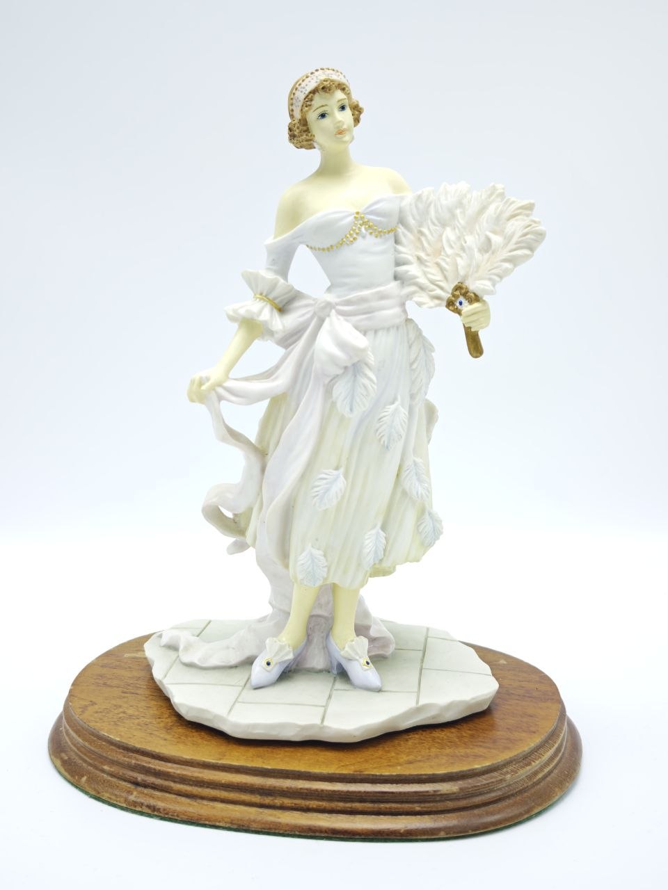 Изящная статуэтка из холодного фарфора изображает даму в вечернем платье с декоративным веером, выполненную с высокой детализацией складок ткани и аксессуаров. Высота изделия 23,5 см, вес 830 г — гармоничный размер для размещения в интерьере или витрине. На основании присутствует маркировка The Leonardo Collection, что подтверждает принадлежность к коллекционной серии. Фигура установлена на устойчивой деревянной подставке, придающей завершённый вид композиции.