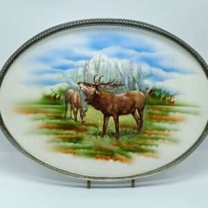 Старинный поднос с ручками «Охота. Природа. Лось. Косуля». Фарфор. Посеребрение