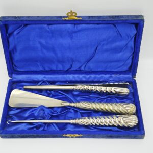 Набор ложка для обуви, щипцы для перчаток, крючок. Серебрение. Англия середина 20 века. Кейс