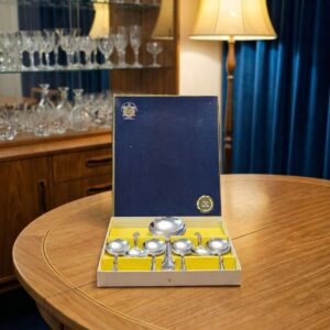 Парадный сервировочный набор с большой ложкой и 6 порционными ложками в оригинальной коробке серебрение Sheffield Англия 1965 год