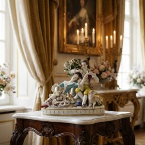Антикварная фарфоровая статуэтка галантная сцена с пастушкой и кавалером с овечкой, ручная роспись, декоративная композиция в стиле рококо, размер 15х13 см, Германия 1920 год