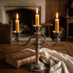 Антикварный канделябр на три свечи с витым держателем, серебрение, классический орнамент, 25 25 см, Ianthe England, Англия, 1970 год