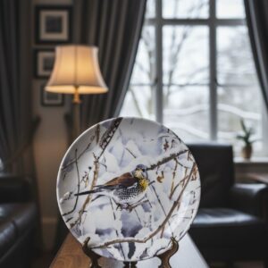 Коллекционная декоративная тарелка “A Watchful Eye – Woodland Winter” с изображением дрозда на заснеженных ветвях, фарфор, деколь, диаметр 20,5 см, 1990 год, Англия, Wedgwood, Сертификат.