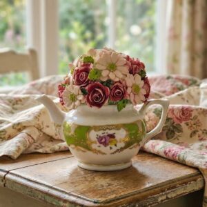 Декоративная фарфоровая композиция в чайнике с розами и ромашками, ручная роспись и позолота, 11х10 см, Япония, 1985 год