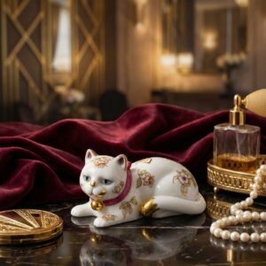 Коллекционная фарфоровая статуэтка Кошка с цветочным орнаментом и позолотой, 8х4 см, США, 1980-е гг., Franklin Mint