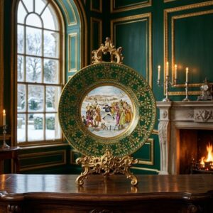 Коллекционная настенная декоративная тарелка The Pickwick Club на льду , зелёный орнамент с золочением, фарфор, диаметр 27 см, серия Christmas Plate №599, Caverswall, Англия, 1979 год