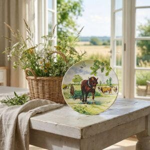 Коллекционная декоративная тарелка из фарфора с сельским пейзажем и сценой работы на сенокосе