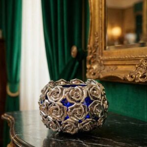 Декоративная посеребренная ваза с рельефом роз и кобальтовым стеклянным вкладышем, 11 8 см, 1970 год, Италия