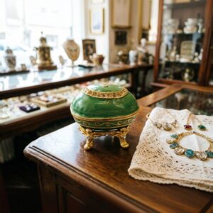 Шкатулка “Яйцо” в стиле Фаберже зелёная с искусственными камнями, 7 см, съёмная подставка.