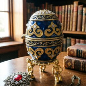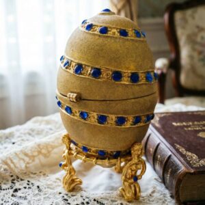 Шкатулка “Яйцо” в стиле Фаберже золотая с синими камнями, металл, прозрачные камни, на фигурной подставке.