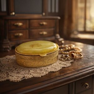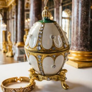 Шкатулка “Яйцо” в стиле Фаберже кремовая с искусственными камнями, 7 см, на съёмной подставке.