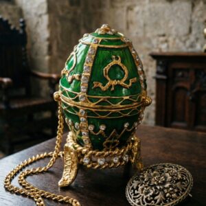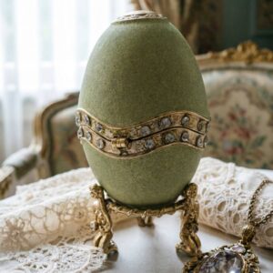 Шкатулка “Яйцо” в стиле Фаберже с искусственными камнями, зелёная, на съёмной подставке.