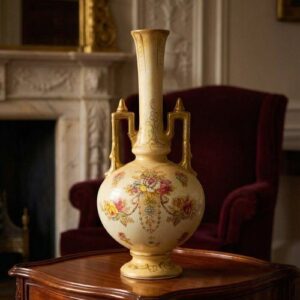 Антикварная фарфоровая ваза с двойными ручками и цветочной гирляндой, ручная роспись, позолота, 28 см, Англия 1925 год, Crown Devon