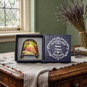 Коллекционный винтажный напёрсток Sutherland, Англия, фарфор с золотой ботанической деколью, в синей коробке,