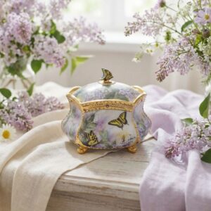 Музыкальная шкатулка фарфоровая с бабочками и цветочным декором, позолота и камни, 10х9 см, Lena Liu, США 2001 год