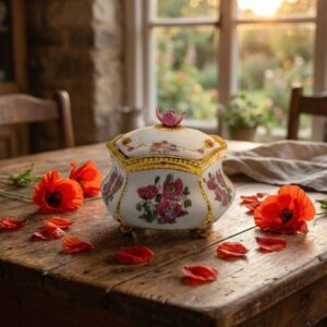 Музыкальная шкатулка фарфоровая с цветочным декором “Мак”, позолота, 7.5х9 см, Ardleigh Elliott, США 2000 год
