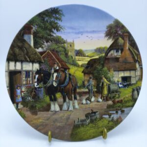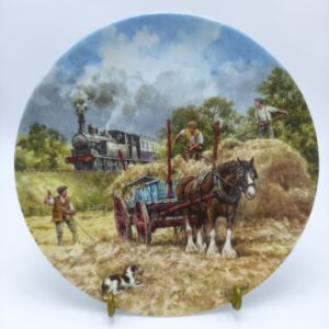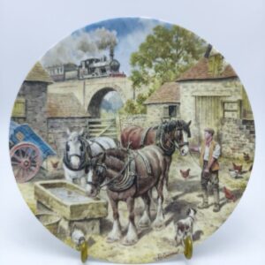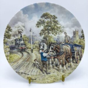 Коллекционная фарфоровая тарелка с художественной сценой сельской жизни, паровозом и лошадьми