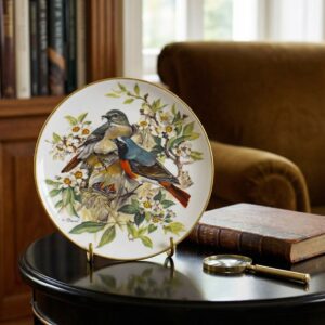 Коллекционная фарфоровая декоративная тарелка с изображением птиц Gartenrotschwanz, 1986 год, диаметр 19,5 см, фарфор с позолотой Tirschenreuth, Германия