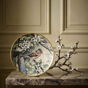 Декоративная настенная тарелка с изображением зяблика среди цветущих ветвей, фарфор, деколь, позолота, диаметр 23 см, Wedgwood Англия 1989