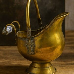 Винтажный латунный зольник с фарфоровой ручкой, Англия антикварный каминный аксессуар XXв., художественная чеканка, сохранённая патина, коллекционная редкость