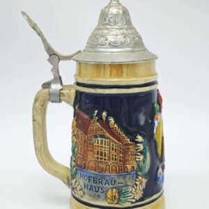 Коллекционная пивная кружка с крышкой. Керамика, рельеф, крышка – сплав металла. Германия 1970 года