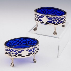 Старинная Пара Солонок Стерлинговое Серебро Кобальт