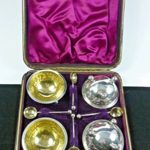 Антикварный Набор 4 Солонки с Ложками Цельное Серебро