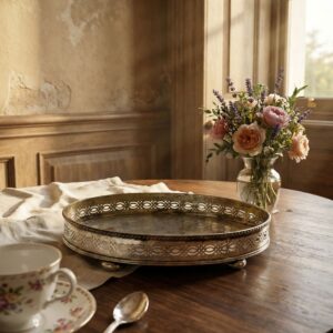 Антикварный сервировочный поднос на ножках с ажурным бортиком, серебрение, овальный поднос для сервировки 20х14.5х3.5 см, Англия 1955 год