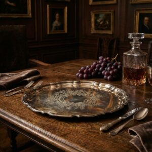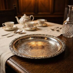 Винтажный сервировочный поднос с гравировкой и фигурным краем посеребрённый 37 см Англия 1960 год