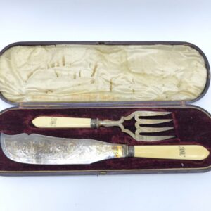 Антикварный набор для рыбы в кожаном футляре, серебрение, ручки из кости