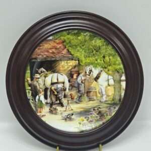 Винтажная декоративная тарелка в деревянной раме «Ремесла старой деревни. Кузнец». Фарфор, деколь. Великобритания 1990, Royal Doulton
