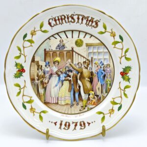 Винтажная рождественская тарелка “Рождественский бал мистера Феццивига 1979” из коллекционной серии. Фарфор. Позолота. Aynsley, Англия