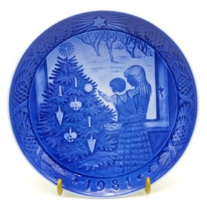 Винтажная рождественская тарелка Royal Copenhagen “Любуемся рождественской ёлкой” (Juletret beundres) 1981 года, редкая коллекционная модель с изображением матери и ребёнка, украшающих ёлку у окна,