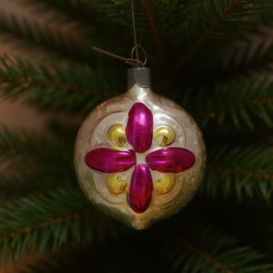 Винтажная елочная стеклянная игрушка с ярким фуксиево-желтым рисунком “цветок”, середина 20-го века, ручная работа