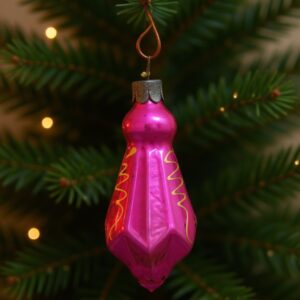 Винтажная стеклянная елочная игрушка в виде розовой капли с орнаментом, ручная роспись