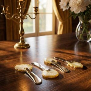 Антикварный набор ножей для масла с рукоятками из натурального агата, 4 шт, длина 13 см, в оригинальной коробке 20,5х16 см, Франция 1978 год