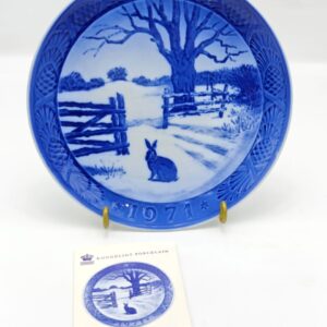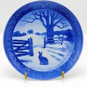 Винтажная декоративная тарелка Royal Copenhagen Заяц в зимнем пейзаже (Hare i vinterlandskab) 1971 года, редкая коллекционная модель с изображением зайца на снежной дороге у забора и дерева