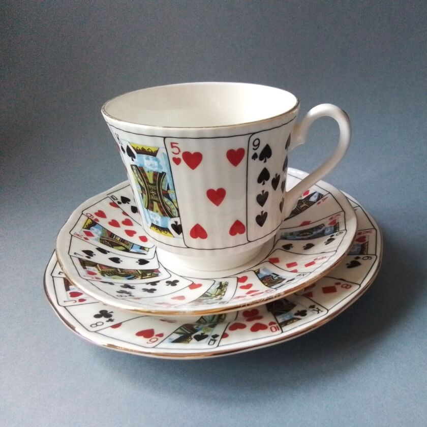 Винтажное кофейное трио, состоящее из чашки, блюдца и пирожковой тарелки. Произведено в Стаффордшире, Англия, во второй половине 20 века из костяного фарфора. Оформлено объёмным, красочным узором игральных карт и позолотой. Трио носит название «Елизаветское». Клеймо от производителя на дне чашки. Кофейное трио в прекрасном состоянии, без сколов и трещин. Станет изысканным украшением кухонного интерьера или частью коллекции.