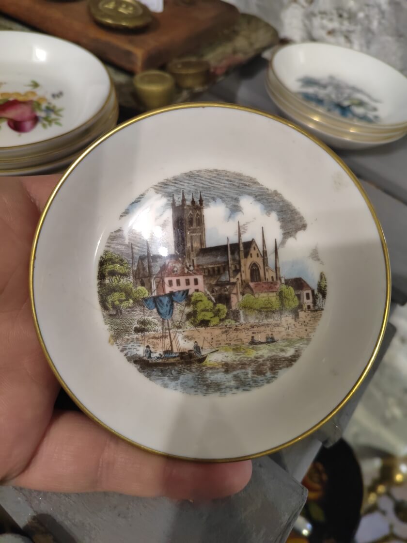 Винтажное фарфоровое блюдце для кодлера. Изготовлено в 20 веке из фарфора на мануфактуре Royal Worcester (на дне есть клеймо производителя). Сохранилось в прекрасном состоянии, без сколов и трещин. Украшено изображением города, дизайн «Достопримечательности Вустера». Имеет золотистую окантовку. Диаметр 9.5см. Предназначено для использования в паре с кодлером, приготовления, подачи и употребления яиц пашот. Станет интересным дополнением сервировки стола. Все лоты выставлены на нескольких площадках поэтому, пожалуйста, перед покупкой уточняйте наличие.