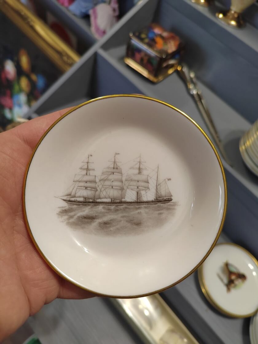 Винтажное фарфоровое блюдце для кодлера. Изготовлено в 20 веке из фарфора на мануфактуре Royal Worcester (на дне есть клеймо производителя). Сохранилось в прекрасном состоянии, без сколов и трещин. Украшено изображением большого парусного корабля, дизайн «Флот». Имеет золотистую окантовку. Относиться к ограниченному выпуску. Диаметр 10см. Предназначено для использования в паре с кодлером, приготовления, подачи и употребления яиц пашот. Станет интересным дополнением сервировки стола. Все лоты выставлены на нескольких площадках поэтому, пожалуйста, перед покупкой уточняйте наличие.