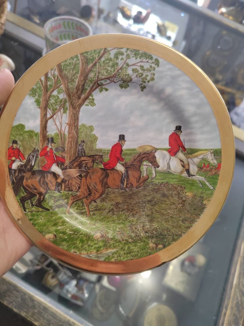 Винтажная декоративная тарелка с изображением сцены охоты верхом. Относится к серии из 6 тарелок «Самые знаменитые сцены охоты». Создана в Англии в середине 20 века. Произведена из костяного фарфора на мануфактуре Stoke-on-trent. Украшена позолоченной окантовкой. Изображение художника J. F. Herring. Стоит клеймо от производителя. Серия выпущена ограниченным тиражом. Тарелка сохранилась в прекрасном состоянии, без сколов и трещин. Станет интересным элементом декора интерьера или частью коллекции. Все лоты выставлены на нескольких площадках поэтому, пожалуйста, перед покупкой уточняйте наличие.