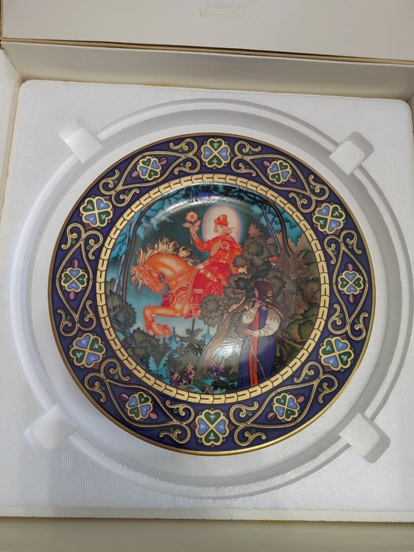 Винтажная декоративная тарелка из коллекции “Русские Сказки”. Изображает сцену из сказки “Аленький Цветочек”. Произведена из костяного фарфора на мануфактуре Villeroy & Boch. Создана в Германии в 1981 году. Выпущена ограниченным тиражом. Занесена в каталог бренда. Имеет уникальный порядковый номер и сертификат подлинности. Лежит в родной коробке. Сохранилась в прекрасном состоянии. Станет интересным элементом декора интерьера или частью коллекции настенных тарелок. Все лоты выставлены на нескольких площадках поэтому, пожалуйста, перед покупкой уточняйте наличие.