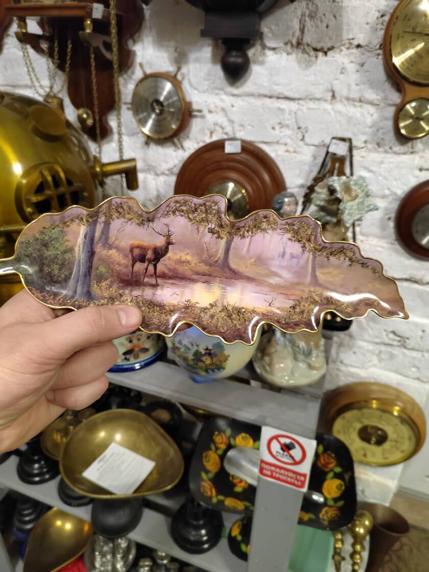 Декоративная коллекционная тарелка в форме дубового листа. Носит название «Morning Maiesty». Относится к серии «Elegance of Nature». Создана фирмой Брадекс (Bradex). Выпущена тиражом, ограниченным 95 днями обжига. Оригинал рисунка создан художником Wendy Reeves и нанесен техникой деколь. Тарелка сохранилась в прекрасном состоянии, без сколов и трещин. Окаймлена 14-каратным золотом. Имеет заводские отверстия для подвеса. Станет интересным элементом декора интерьера или частью коллекции. Все лоты выставлены на нескольких площадках поэтому, пожалуйста, перед покупкой уточняйте наличие.