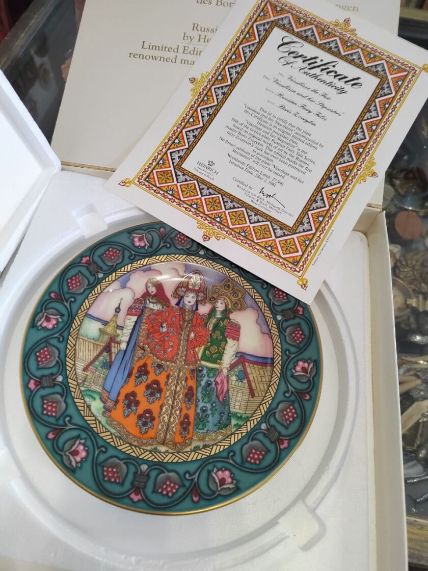 Винтажная декоративная тарелка из коллекции «Русские Сказки». Изображает сцену из сказки «Василиса Прекрасная». Произведена из костяного фарфора на мануфактуре Villeroy & Boch. Создана в Германии в 1981 году. Выпущена ограниченным тиражом. Занесена в каталог бренда. Имеет уникальный порядковый номер и сертификат подлинности. Лежит в родной коробке. Сохранилась в прекрасном состоянии. Станет интересным элементом декора интерьера или частью коллекции настенных тарелок. Все лоты выставлены на нескольких площадках поэтому, пожалуйста, перед покупкой уточняйте наличие.