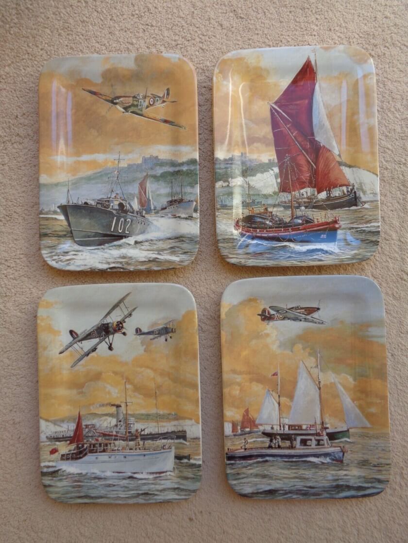 Набор из 4-х коллекционных тарелок, выпущенный в Англии в 1990-х годах. Тарелки созданы из оригинального костяного фарфора. Производство мануфактуры “Bradford Exchange”. Рисунки нанесены техникой деколь. Тарелки относятся к серии “Дух Дюнкерка” и изображают сцены сражений. Имеют индивидуальные сюжеты с названиями. Выпущены ограниченным тиражом. Тарелки сохранились в идеальном коллекционном состоянии. Станут восхитительным элементом декора комнаты или частью коллекции. Все лоты выставлены на нескольких площадках поэтому, пожалуйста, перед покупкой уточняйте наличие.