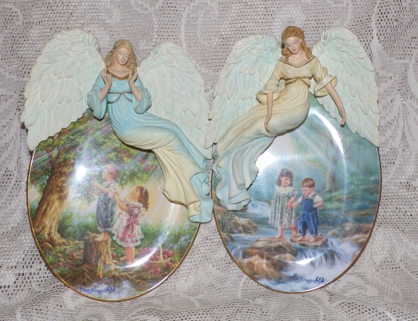 Пара винтажных декоративных тарелок, украшенных фигурками ангелов. Относятся к серии «Our Loving Guardians». Созданы в Англии в 1998 году. Произведены из костяного фарфора. Выпущены фирмой Bradford Exchange (Bradex) тиражом, ограниченным 295 днями обжига. Занесены в каталог бренда. Оригинальные изображения созданы художницей Доной Гелсингер и перенесены техникой «деколь с подрисовкой». Каждая тарелка имеет личный порядковый номер и подпись художницы. Сохранились в прекрасном состоянии, без сколов и трещин. Станут восхитительным элементом декора интерьера или частью коллекции. Все лоты выставлены на нескольких площадках поэтому, пожалуйста, перед покупкой уточняйте наличие.