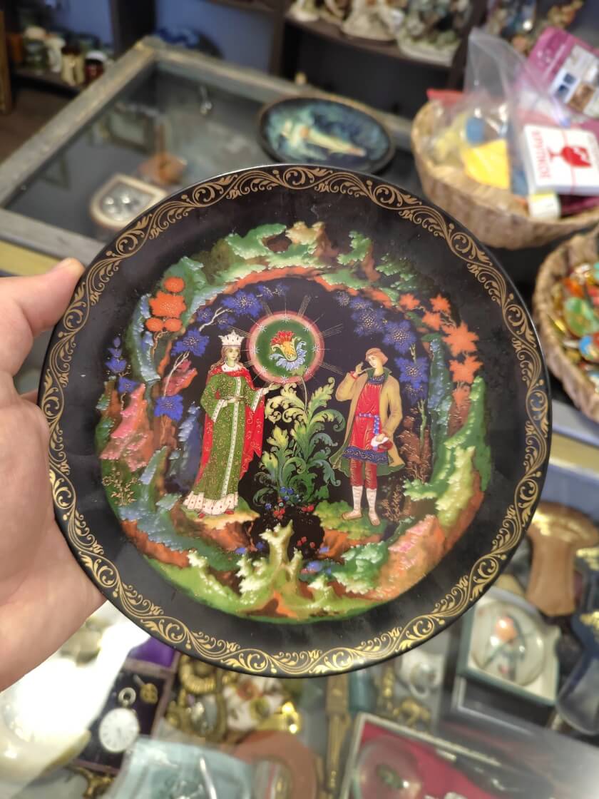 Декоративная тарелка под названием «Каменный цветок». Принадлежит к серии «Русские Сказки», является единственным официальным выпуском палехского художника Валерии Вольшаковой. Создана по мотивам поэм А.С. Пушкина. Художник Валерия Вольшакова создала авторский оригинал тарелки в традициях миниатюрной росписи знаменитого Палеха с сохранением всех оттенков красок и применением натурального золота, специально для этого издания. Тарелка является 8 экземпляром из серии «Русские Сказки», произведена из фарфора в 1990 году тиражом, который ограничен 195 днями обжига. На оборотной стороне подробное описание с указанием названия, серии и автора на русском языке. Декоративная тарелка станет прекрасным украшением интерьера или частью коллекции. Снабжена заводскими отверстиями для подвеса. Все лоты выставлены на нескольких площадках поэтому, пожалуйста, перед покупкой уточняйте наличие.