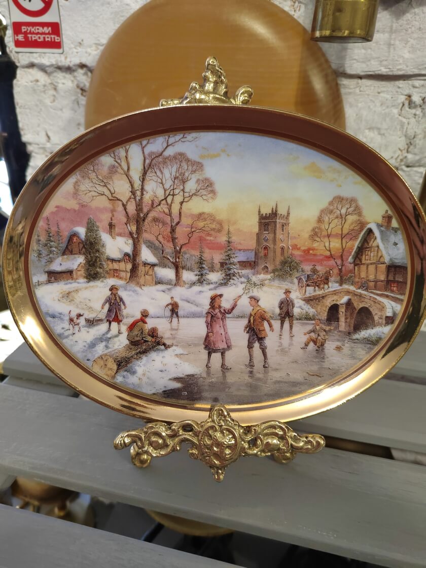 Коллекционная декоративная тарелка, сделанная из оригинального костяного фарфора. Носит название «Под Омелой», из серии «Золотое Рождество». Производство мануфактуры «Bradford Exchange». Рисунки нанесены техникой деколь, стоит подпись художника. Тарелка выпущена ограниченным тиражом. Имеет личный уникальный номер в мировом каталоге фарфоровых изделий Bradeх. В идеальном коллекционном состоянии. Имеет заводские отверстия для крепления. Все лоты выставлены на нескольких площадках поэтому, пожалуйста, перед покупкой уточняйте наличие.