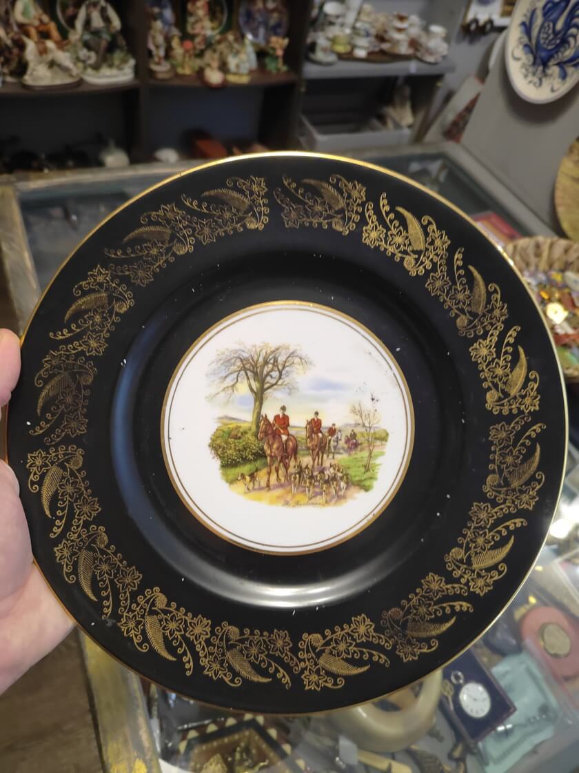 Большая винтажная декоративная тарелка с изображением английской охоты верхом с собаками. Тарелка создана в середине 20 века в Англии. Произведена из костяного фарфора. Стоит клеймо от производителя. Оригинальный рисунок нанесён техникой деколь. Оформлена позолотой. Сохранилась в прекрасном состоянии, без сколов и трещин. Станет интересным элементом декора интерьера или частью коллекции. Все лоты выставлены на нескольких площадках поэтому, пожалуйста, перед покупкой уточняйте наличие.
